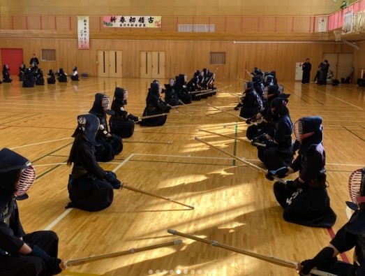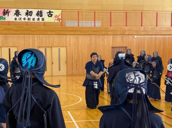 米沢市剣道連盟主催の「新春初稽古」が九里学園高校体育館で行われ、市内外の小中高生、社会人が大勢参加しました。