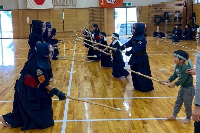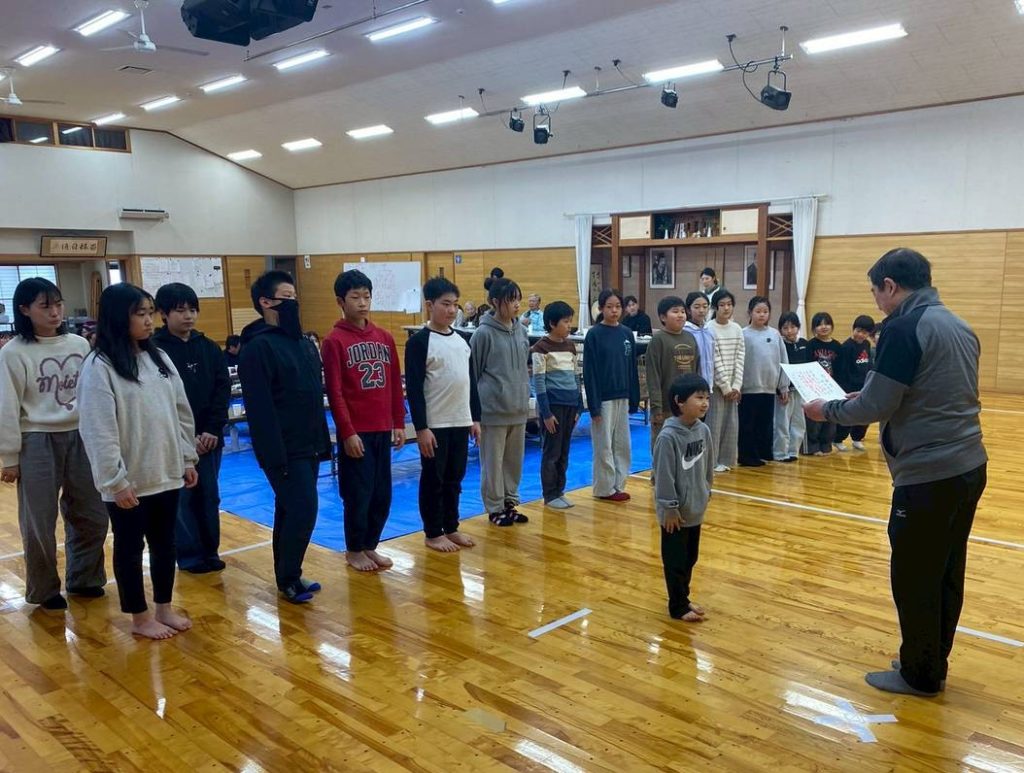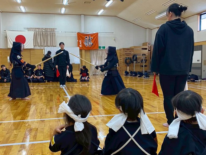 初心者の基本演武や学年別試合を行い、寒稽古の成果を披露しました。